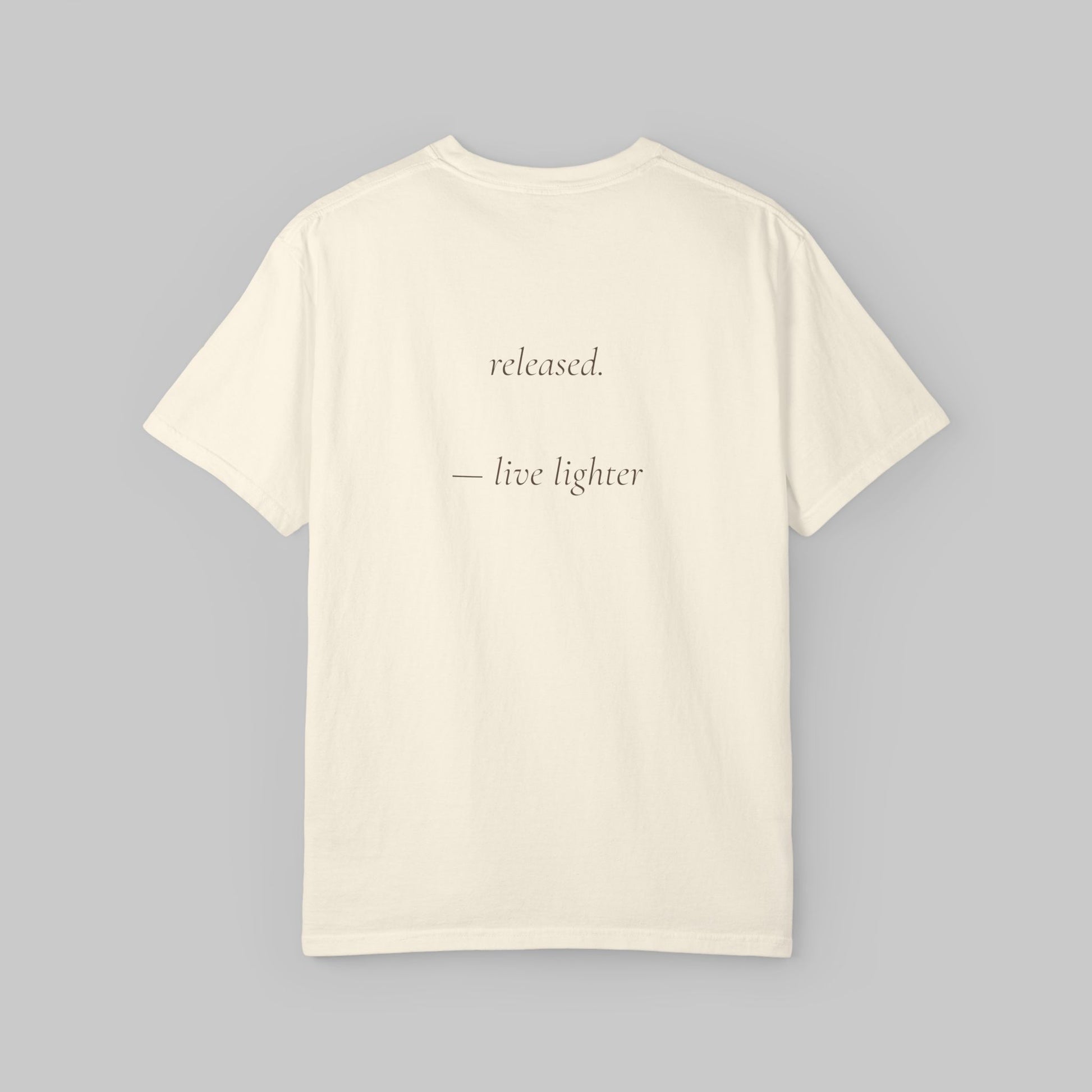 This garment-dyed tee carries a quiet, reflective energy. The front’s understated serif word “FORGIVENESS.” and the back’s gentle script “released — from Brian” feel like a personal note worn close to the heart. The heavyweight, relaxed fit and soft, broken-in color make it an easy layer for slow mornings, long walks, or evenings around a low table talking until the air clears. It sits like a companion piece—comforting, honest, and unobtrusive—so the message reads as lived experience rather than proclamation. Choose a muted shade to keep the tone intimate, or a warmer hue to bring that message into everyday rotation.