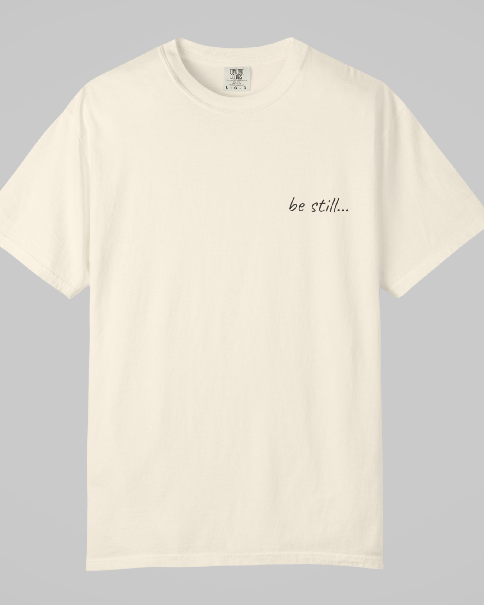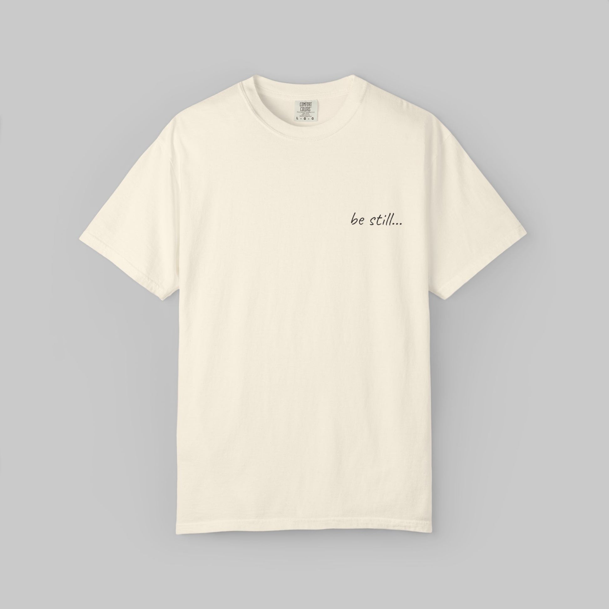 The “be still…” tee is designed to feel like a pause you can wear — soft, relaxed, and intentionally understated. Its garment-dyed finish gives it a naturally worn-in character, while the minimal script across the chest invites calm without demanding attention.